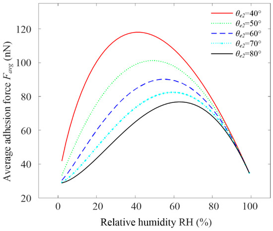 Figure 10 shows the variation rule of the theoretical graphene adhesion force with a static contact angle θe2 and RH. The average adhesion force Favg in the figure refers to the average of all adhesion forces when decreased from 90° to 0° under a certain RH. the adhesion force of graphene increased with the RH and had a maximum value. The adhesion force of the small static contact angle θe2 was higher than the corresponding value of the large static contact angle θe2, because the smaller the static contact angle θe2, the more hydrophilic it was. Moreover, the peak adhesion force for the smaller static contact angle θe2 appeared at lower a RH, which was consistent with the actual measurement in some of the relevant literature [12,49]. It should be noted that chemical reaction or group adsorption on the contact surface was not considered.