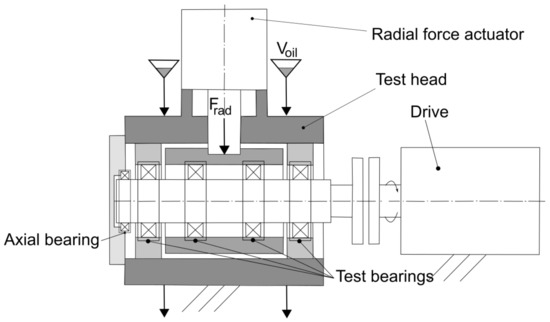 A rolling bearing life test rig, as shown in Figure 8, was used to conduct the tests. The rig allows for the simultaneous testing of four bearings under comparable loading conditions. The radial force, Frad, was applied using an actuator located on a hollow shaft that contains two bearings and interposed disk springs. These inner bearings transfer the force to the shaft, which is connected to the two outer bearings. Due to the symmetrical arrangement of the outer and inner bearings, all bearings experienced equal loading. A circulating lubrication system was used for oil feed. To detect fatigue damage at an early stage during the tests, a vibration-based condition monitoring system was utilized [26].