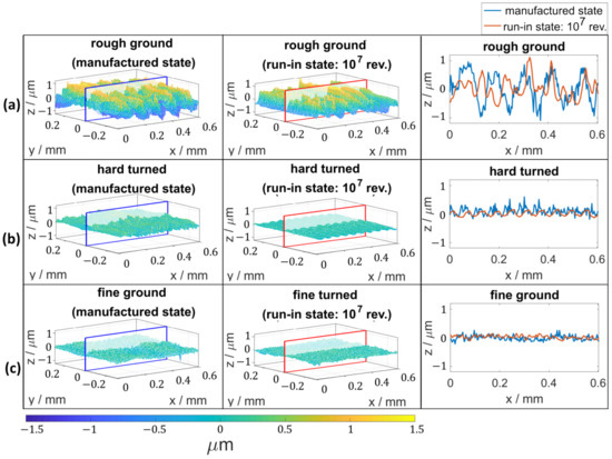 Measured real inner ring surface (a) rough ground, (b) hard turned, and (c) fine ground in manufactured and in run-in states.