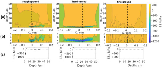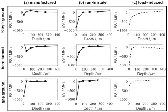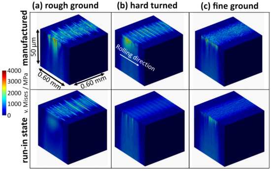 The results of the stress calculation for the differently finished bearing rings in the manufactured and run-in states are shown in Figure 12. By comparing the different surface variations, the rough ground surface shows the highest stresses in both states. These are located in a surface-near area. In the simulation case with surfaces in the run-in state, it can be observed that the stress states for the hard-turned and the fine-ground variant are in the same range.