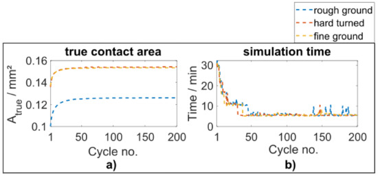 In order to compare the surface topography qualitatively, the true contact areas are evaluated, as indicated in Table 7. The larger the true contact area , the more equal the load distribution, and the locally resulting stresses become smaller. In a manufactured state, the fine-ground and hard-turned surfaces have similar true contact areas of 0.1275 mm2 and 0.1265 mm2, while the rough-ground surface has the smallest true contact area of 0.0883 mm2 and thus indicates a worst tribological behavior. After 107 revolutions, the results of the contact simulations show an increase in the true contact area to 23%, 61%, and 49% for the rough-ground, hard-turned and fine-ground surfaces, respectively, which is due to the flattening of the roughness peaks. This leads to a slightly higher for the hard-turned variant compared to the fine-ground variant.