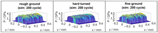 The purely elastically simulated contact pressures are shown in Figure 11. In the manufactured state, maximum pressure values of 15.9 GPa, 15.9 GPa, and 17.4 GPa are obtained for the rough ground, hard turned, and fine ground surfaces respectively. These pressure values result in the selected measuring area at the highest asperites of the respective surfaces. General conclusions cannot be formed on the basis of the sample measurement shown.