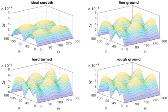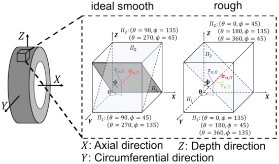 It can be observed in Figure 19 that the maximum shear strains occur at the critical planes with the angle combinations θ = 90°, 270° and ϕ = 45°, 135° for the ideally smooth surface and θ = 0°, 180°, 360° and ϕ = 45°, 135° for the rough surfaces. The orientation of the critical plane can be determined by the component of the normal vector given in Equation (4).
