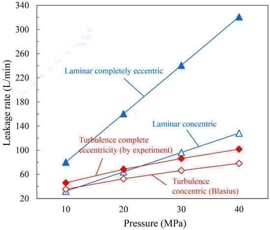 Currently, the existing leakage calculation model of the annular channel is too simplified, resulting in a significant deviation in leakage calculation. Experimental tests have indicated that the leakage rates of turbulent and laminar flow are 1.3 times and 2.5 times that of concentric flow, respectively []. Using the parameters in Table 1, leakage of different calculation models at a differential pressure of 10–40 MPa can be calculated, as shown in Figure 1. The results indicate that the leakage ranges of the laminar flow model and turbulent flow model are 128.3–320.8 L/min and 78.2–101.7 L/min, respectively with the deviation of output flow caused by eccentricity reaching 192.5 L/min and 78.2 L/min respectively. The results indicate that eccentricity has a signification influence on the leakage of the laminar and turbulent flow. In addition, studies on the effect of structural deformation and water compressibility of large-scale annular gaps on leakage are rarely mentioned, affecting the accuracy of the leakage model.