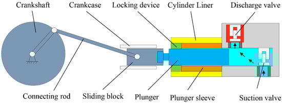In this work, a five-plunger pump with a flow rate of 1600 L/min and a pressure of 40 MPa is taken as the research object. The structure of the plunger pump is shown in Figure 2, including the crankshaft, connecting rod, slider, plunger, plunger sleeve, cylinder liner, and locking device. When a plunger pump is working, the rotation of the crankshaft drives one end of the connecting rod to make a circular motion. The other end of the connecting rod drives the slider and the plunger to make a linear reciprocating motion in the cylinder liner. During the reciprocating movement of the plunger, the volume of the closed cavity formed by the high-pressure cylinder liner, the plunger sleeve, and the plunger changes, altering the liquid suction and discharge of the plunger pump. In addition, the high-pressure seal of the plunger pump is in the cylinder liner, which seals the high-pressure liquid through the small gap between the plunger sleeve and the plunger.