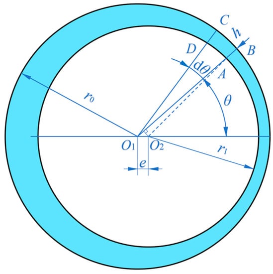 Taking the section of the angle at θ as dθ, and the length of the corresponding small arc CB as dy, CB = dy = r0dθ can be obtained. Because dθ and CB are small, the micro-element gap ABCD can be considered a parallel wall gap with a gap of h. By substituting dy = r0dθ into Equation (7), the leakage flow rate of the eccentric annular channel can be written as follows: