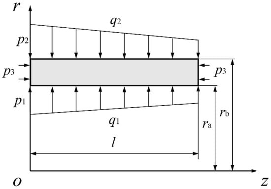 As indicated in Figure 4, this study analyzed the stress and deformation of a thick-walled cylinder and then derives the deformation of the plunger pair. Because the plunger pair is axisymmetric in space, cylindrical coordinates are used for analysis. According to Equations (4) and (11), in the laminar and turbulent flow state, the pressure of the annular channel is proportional to the sealing length. Therefore, the loading boundary conditions on the cylinder can be expressed as follows:
