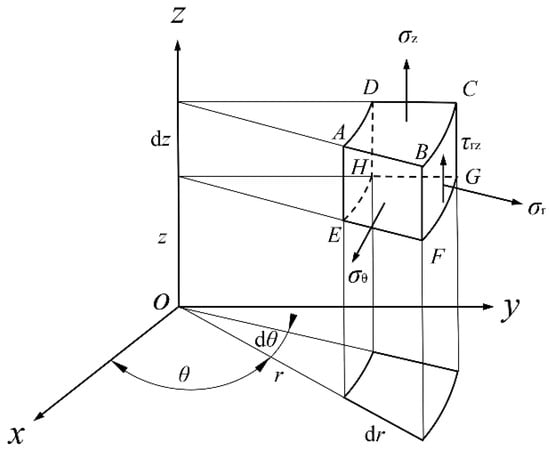 The microscopic hexahedron ABCDEFGH is taken from the thick-walled cylinder, as shown in Figure 5. The displacement function Φ is generally used to solve this spatial axisymmetric problem, so the deformation and stress components can be written as []: