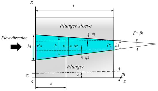Annular channel flow is a classical hydrodynamic problem []. Due to the throttling effect of the gap, the fluid pressure changes along the axial direction. Under the high working pressure, not only is the structure of the plunger pair deformed like a funnel but the fluid density in the plunger cavity is also changed. Furthermore, the plunger and the plunger sleeve are often eccentric due to the biased load and machining errors in the actual work. These factors may affect the leakage of the plunger pair together. Therefore, the deformation and leakage mechanism of the annular channel must be considered to improve the accuracy of the calculation model.