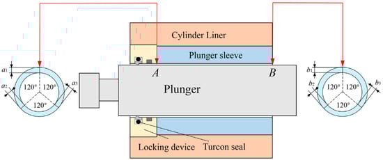 Figure 9 shows a schematic diagram of the eccentricity test of the plunger pair. The plunger is first fixed by tightening the floating structure, and then the locking device is removed. The gaps at points A and B are measured in three directions using a feeler gauge with an accuracy of 0.001–0.1 mm, and then the locking device was reinstalled.