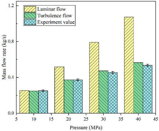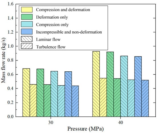 This section explores the influence of compressibility of high-pressure water medium and structural deformation on leakage based on different leakage models, as shown in Figure 12. It can be concluded that the trend of calculated leakage under the laminar flow and turbulent flow is the same. After considering the compressibility of the water medium and structural deformation, the leakage of the annular channel increases. In general, the influence of structural deformation on leakage is more significant than the compressibility of the water medium, and the impact is different in different flow states. It is reported that the influence of the structural deformation of the plunger pair on the leakage rate is 3.9% and 4.92% under the laminar flow regime of 30 MPa and 40 MPa, respectively. The effects of 30 MPa and 40 MPa in a turbulent flow regime are 2.25% and 2.84%, respectively. It can be suggested that the compressibility of water has little influence on the leakage, and the influence of 30 MPa and 40 MPa in laminar flow is 0.69% and 0.92%, respectively. The effects of 30 MPa and 40 MPa in the turbulent flow regimes are 1.04% and 1.19%, respectively.