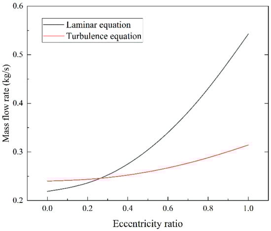 Based on different leakage models, this section explores the effects of water compressibility, eccentricity and structural deformation on leakage. When the pressure of the plunger pair is 10 MPa, laminar flow and turbulence are used to calculate the leakage under different eccentricity and gap heights, as shown in Figure 11. From the figure, the leakage of annular channels in both laminar flow and turbulence increases with the increase of eccentricity, and the growth rate of laminar flow is greater than that of turbulence. When the eccentricity is 0–0.29, the leakage of laminar flow is smaller than that of turbulent flow. When the eccentricity is 0.29–1, the leakage of laminar flow is greater than that of turbulent flow. It is worth noting that, compared with the concentric leakage, the total eccentric leakage in laminar flow is 2.48 times of the former. In turbulent flow, it is 1.31 times.