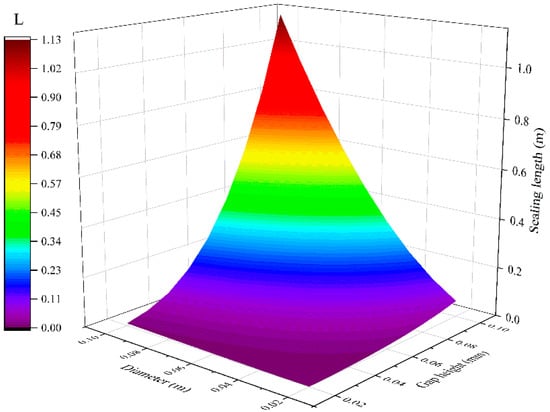 For a large-flow plunger pump, the volumetric efficiency of the pump needs to reach 88% at 40 MPa. After evaluation, assuming that the volumetric efficiency of the rest of the pump remains unchanged, the leakage of the gap seal needs to be controlled within 5% to ensure the efficiency of the pump. A single plunger leakage cannot exceed 0.607 kg/s at 40 MPa. When the leakage of the plunger pair is 0.607 kg/s, the parameters of the plunger diameter, sealing length, and gap height are shown in Figure 13. It can be concluded that the influencing factors on the leakage are gap, plunger diameter, and seal length in descending order.