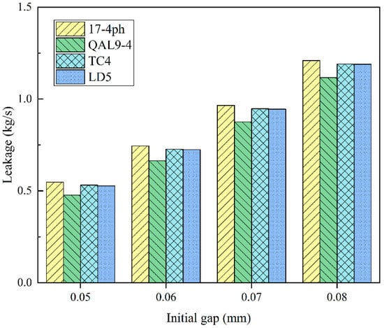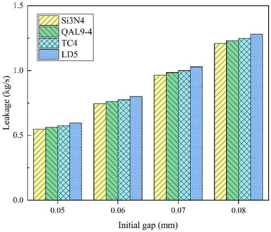Figure 15 shows the leakage of the Si3N4 plunger sleeve paired with other plungers of different materials. It is found that the leakage of the plunger pair from large to small is 17-4PH, TC4, LD5, and QAL9-4. For plungers of different materials, with the increase of Poisson’s ratio of the plunger, the gap height between the inlet and outlet decreases, resulting in the decrease of leakage. With the increase of elastic modulus, the inlet gap h1 decreases, and the outlet gap h2 increases. It can be seen from the formula that the decreasing amplitude of h1 is positively correlated with 1 − 2αp, while the increasing amplitude of h2 is positively correlated with αp. Therefore, the influence of elastic modulus on leakage depends on the values of these two values. When 1 − 2αp > αp, the elastic modulus increases, the overall gap height decreases, and the leakage decreases, whereas the leakage increases. In conclusion, increasing Poisson’s ratio can reduce the clearance height of the plunger pair and reduce the leakage, and the relationship between the elastic modulus and the leakage depends on Poisson’s ratio.