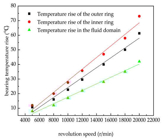Figure 6 shows the relationship between the speed and the temperature rise of the outer ring, the inner ring, and the fluid domain of the bearing. It can be seen from the figure that the temperature rise performance of the bearing at high speed is significantly affected by the speed. The temperature rise of the inner and outer rings of the bearing and the fluid domain increases with the increase in the bearing speed. In addition, the degree of increase of these parameters also gradually increases. The speed of the bearing is proportional to the temperature rise of the inner and outer rings of the bearing and the fluid domain. The discrete points in