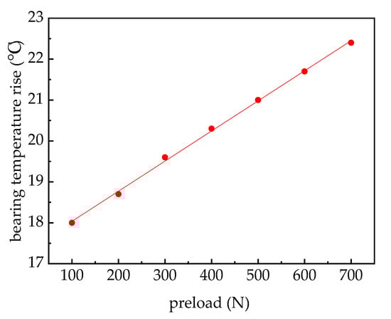 The bearing preload is in direct proportion to the temperature rise of the bearing outer ring. The empirical formula of the temperature rise of the bearing outer ring under different preloads can be obtained by linear fitting of discrete points: