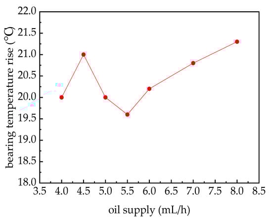 Figure 8 shows the change in the temperature rise of the bearing as a function of the oil supply of the lubrication system. It can be seen from the figure that the temperature rise of the bearing increases first and then decreases with increasing oil supply, and finally increases once again. This is because at the beginning (oil supply is 4–4.5 mL), it may be in a lean state, and the friction between the roller and the inner and outer rings generates more heat. As the viscous torque of the lubricating oil increases, the heat generated by the stirring of the lubricating oil also increases; thus, increasing the temperature of the outer ring of the bearing. As the oil supply continues to increase (4.5–5.5 mL), the oil film between the bearing rolling element and the raceway gradually becomes complete, the friction heat of the bearing decreases, the heat taken away by the lubricating oil increases, and the temperature rise of the bearing decreases. In addition, the stirring friction gradually increases and reaches an equilibrium state at a certain value of oil supply. As a result, the temperature rise of the bearing is the lowest, and the oil supply is also optimum for the bearing. However, as the oil supply continues to increase (5.5–8 mL), the bearing is in an oil-rich state, and thus an excessive amount of oil is present for forming the oil film. This large amount of lubricating oil increases the heat generated due to the stirring of the bearing. When it is greater than the heat taken away after improving the lubrication conditions, the temperature rise of the bearing increases with increasing oil supply. Therefore, the change in the bearing temperature at high speed is sensitive to the change in the oil supply. When the lowest temperature rise point of the outer ring of the bearing is at approximately 5.5 mL of the oil supply, a good oil film can be formed in the bearing.