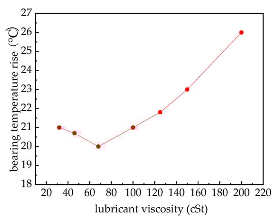 Figure 9 that, within a certain viscosity range, the influence of lubricating oil viscosity on bearing temperature rise is small. However, when the viscosity exceeds a certain value, the bearing temperature rise gradually increases. The change trend of lubricating oil viscosity on bearing temperature rise characteristics is consistent with the theory of elastohydrodynamic lubrication. However, when the viscosity of the lubricating oil is too large, the friction torque related to the viscosity of the lubricant increases, the heat generation increases, and the temperature rise of the bearing increases. Lubricating oil with higher viscosity is easy to form oil film, but at the same time, the heat generated by viscous torque is also increasing, so the viscosity of lubricating oil should be reasonably selected according to the actual working conditions such as bearing speed and load. At the same higher speed, the lubricating oil has the best viscosity value.