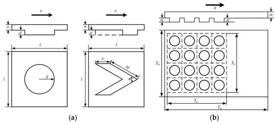 The optimization of the texture characteristics is carried out by using a single V-shaped and circular micro-texture shown in Figure 1a. The texture parameters are optimal in that the texture is an ordered array with regular distribution, so the flow field entrance and exit walls perpendicular to the sliding direction are set as periodic boundaries, and the two walls parallel to the sliding direction are set as symmetric boundaries. The surface texture mode shape shown in Figure 1b is used to study the overall distribution characteristics of the texture and the law of surface coverage affecting the lubrication performance, and the entrance/exit boundary perpendicular to the sliding direction is set as the pressure inlet/outlet boundary in the calculation.
