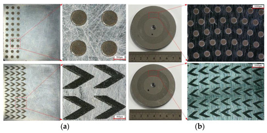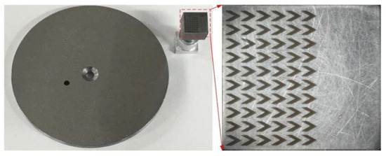 The process parameters for laser processing of the texture: maximum laser power of 7 W, laser wavelength of 355 nm, laser spot processing diameter of 50 μm, laser repetition frequency set to 20 KHz, laser power magnitude set to 60%, laser pulse width < 25 ns, laser scan line spacing set to 0.005 mm, and laser energy density of 5.61 J/cm2. The laser scanning speed for obtaining a specific texture depth was determined through the test as 145 mm/s and 130 mm/s for processing a texture of 8 μm depth on the upper and lower specimen surfaces respectively; when the processed texture. Figure 2 and Figure 3 show the actual picture of the upper and lower specimens and the laser-processed surface structure of the specimens, respectively.