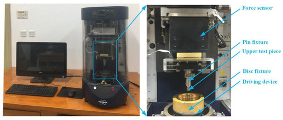 For the tribological performance test, the UMT-2 shaped tribological wear tester was selected, as shown in Figure 4. Table 1 shows the device parameters of UMT-2. For the upper test piece, the surface of the pin head was machined, and the machining range was a square with a side length of 10 mm. For the lower test piece, the surface of the base plate was machined, and the machining range was a circular area with a radius of 15~25 mm, and the width of the machining was 10 mm. This parameter setting was used to ensure that the relative motion speed between the two friction pairs remained the same when conducting the tribological wear test, and both were 1 m/s, with a test duration of 1200 s and a lubricant dynamic viscosity of 0.03833 Pas. Tribological tests were conducted in a room temperature environment.