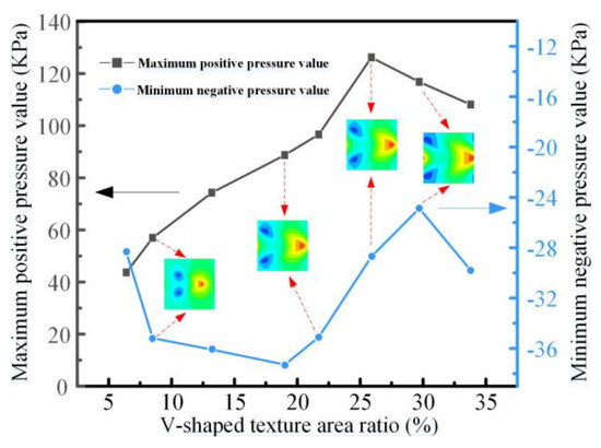 Maximum positive and negative pressure value change curve of V−shaped texture under different area ratios.