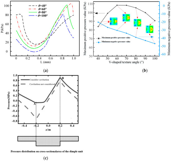 Maximum positive and negative pressure value and pressure change curve of V−shaped texture with different angles between sides: (a) Maximum positive and negative pressure value change curve; (b) Center section pressure variation curve; (c) Pressure distribution on cross-sectionalarea of the dimple unit provided by Wang et al. [40].