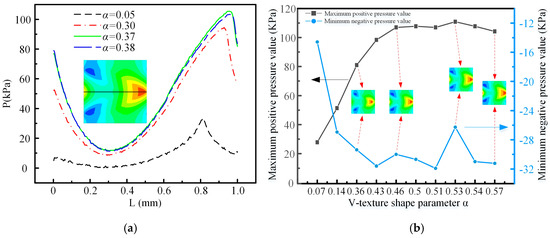 Figure 8a shows the pressure variation curves of the central section of the V-shaped texture with different shape parameters, and the following results could be obtained through the analysis of the variation curves. Combined with the maximum positive and negative pressure change curves under different shape parameters shown in Figure 8b, when the shape parameter α of the V-shaped texture reached 0.53, the pressure in its central section was maximum, and the texture characteristics at this time could support the extrusion effect of the lubricating medium to provide the maximum load-bearing force for the oil film formed between the two friction pairs.