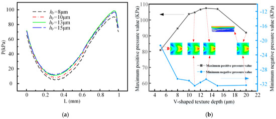 Maximum positive and negative pressure value and pressure change curve of V−shaped texture with different depths: (a) Pressure variation curve of central section; (b) Maximum positive and negative pressure value change curve.
