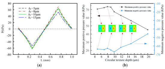 Maximum positive and negative pressure value and pressure change curve of circular texture with different depths: (a) Pressure variation curve of central section; (b) Maximum positive and negative pressure value change curve.