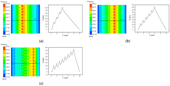 By comparison with Figure 7c, it can be seen that the flow field pressure change curve obtained by the simulation results in this paper has the same trend as the pressure change curve obtained by the simulation results in published papers, which proves that the numerical simulation program is correct.