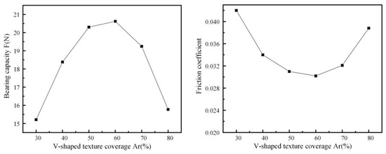 Figure 12 shows the change curves of oil film bearing capacity and friction coefficient between two interfaces of relative motion under lubrication conditions with different coverage of V-shaped texture. In addition, the texture coverage of the circular texture used as a comparison was optimized, and the results showed that when the proportion of circular texture surface was 50%, it could provide the maximum oil film bearing capacity to separate the two opposing motion interfaces, corresponding to the smallest friction coefficient and the best lubrication characteristics.