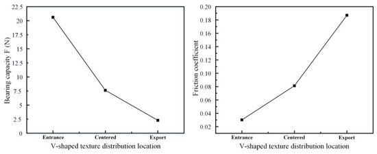 Comparing the pressure change curve of the cross-section in Figure 13, it could be concluded that under the condition of constant texture coverage, as the texture distribution on the surface of the specimen approached the exit position of the flow field, the positive pressure area would be disturbed by the low-pressure area formed by the two flanks, and thus the positive pressure value tended to decrease along the sliding direction. From the pressure distribution cloud shown in Figure 13, we can see that the lubricating medium in the V-shaped texture formation of the negative pressure area of the two wings of the area of the proportion of the texture distribution positioned closer to the exit position gradually increased, when the positive and negative pressure offset effect was also correspondingly enhanced. Thus, it would make the lubrication surface of the oil film bearing capacity present a trend of reduction. When the distribution of the texture characteristics is located away from the inlet position of the flow field, the lubrication surface of the oil film in the sliding direction of the convergence effect was weakened, such that the dynamic pressure between the two interfaces led to reducing the fluid, making the friction lubrication performance worse. With the texture distribution position just in the lubricating medium formed at the entrance of the flow field, the two relative motions of the interface between the lubricating medium because of the shape of the V-shaped texture characteristics of the obvious convergence compression phenomenon, for the texture convergence gap dynamic pressure has an enhanced effect; and when the texture distribution is near the exit position, the lubricating medium in the flow of the texture dispersion gap, the formation of a larger negative pressure area, and smaller negative pressure value are observed to occur. Therefore, the lubrication effect was better when the texture was distributed in the inlet position, as shown in Figure 14.