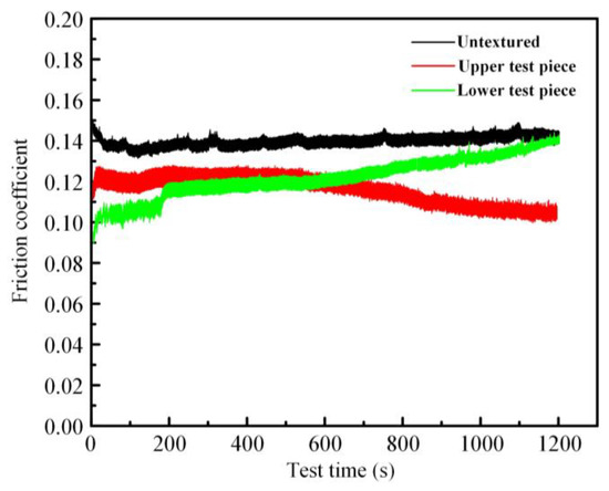 The test time for each group of tests was set to 20 min. During the test, the sampling frequency was set to 100 Hz. In order to reduce the error during the test, the single test results with the overall trend error within 5% of the average friction coefficient curve of each group measured under the same test conditions were taken as the research object after multiple groups of tests. Analyzing the trend of the V-texture friction coefficient curve shown in Figure 15 and comparing different friction coefficients, it could be concluded that in the pin-to-disk test, the friction coefficient was the smallest when only the V-texture was processed on the bottom surface of the upper test piece, and there was also a trend of decreasing the friction coefficient as the friction lubrication test was carried out. The friction coefficient decreased because after a period of testing, the friction and wear between the interface of the two relative movements tended to stabilize, and with the formation of a more stable lubricant film at the contact position, the oil film bearing capacity also increased, for the lubrication medium and the test piece surface between the fluid dynamic pressure has a certain enhancement effect. It is worth noting that when the crater of V-shaped texture was on the surface of the upper test piece, the dynamic pressure generated by the lubricating medium had a favorable effect on the formation, so there was a trend that the friction coefficient decreased with the increase of the test length, and when the crater of V-shaped texture was prepared only on the surface of the lower test piece, the friction coefficient was less than the test friction coefficient of the untextured surface but greater than the test friction coefficient of the upper test piece after the texture treatment. From the test results, it could be seen that the specimens with V-shaped texture on the contact surface showed good friction reduction performance in the pin-to-disk test. In addition, the friction coefficient was smaller, and the lubrication effect was better when the texture crater was prepared on the upper specimen surface.