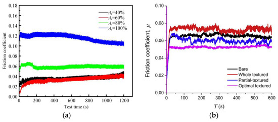 By comparison with Figure 16b, it can be seen that the texture friction coefficients obtained by the test results in this paper under different surface coverage rates have the same trend as the test results in published papers, which proves the correctness of the test results in this paper.