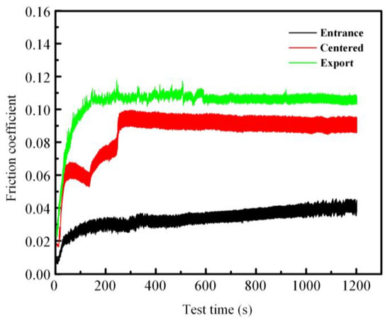 In this group of tests, the texture structure was selected for the bottom surface of the upper test piece, texture structure processing position for the lubricating medium inlet, centered and outlet position for the test, in order to study the texture structure distribution position on the lubrication performance of the shadow, where the V-shaped texture structure coverage is 60%. Experimental test results are shown in Figure 17.