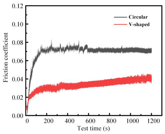 In order to study the effect of texture shape on the friction coefficient, the geometric characteristics of the V-shaped texture were set as follows: texture shape parameters α = 0.53, Sp = 25.9%, hp = 13 μm, θ = 60°, the offset distance of the pin head from the center of the disk was set to 20 mm, and the coverage of the texture characteristics in the texture structured area of the upper and lower specimen surfaces were 100%.