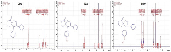 1H NMR and molecular structures of DDA, PDA, and MDA compounds.