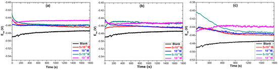 Figure 2 shows the variation of EOCP as a function of time for carbon steel immersed in 1.0 mol/L HCl acid solution with and without various concentrations of DDA, PDA and MDA compounds. Results show that for all the three inhibitors, the EOCP potential increases until it reaches a stable potential after 600 s of immersion, then remains stable. Additionally, we infer from the potential curves that EOCP goes in the direction of positive values when inhibitor concentration rises (from −0.474 V for the blank solution to −0.446, −0.451 and −0.439 V for DDA, PDA and MDA inhibitors at 10−3 mol/L concentration, respectively). The positive shift in the OCP suggests that inhibitor molecules have increased the corrosion resistance of the carbon steel, reducing its tendency to corrode [34]. The curves show some fluctuations with increasing the time of the experiment, which may indicate that inhibitor molecules have effectively adsorbed on the steel surface [35,36]. Previously reported isoxazoline derivatives have showed the same behavior for carbon steel when added to HCl solutions [37].