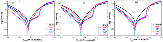 The PPCs were used to understand the mechanism of metal dissolution and the effect of inhibitor addition on the cathodic and anodic corrosion behavior. Figure 3 shows the potentiodynamic polarization curves of carbon steel in 1.0 mol/L HCl medium without and with different concentrations (5 × 10−5, 10−4, 5 × 10−4 and 10−3 mol/L) of the inhibitors at 298 K. Electrochemical corrosion variables such as corrosion current density (icorr), corrosion potential (Ecorr), anodic (βa) and cathodic (βc) Tafel constants, surface coverage (θ) and corrosion inhibition efficiency () were calculated and listed in Table 1.