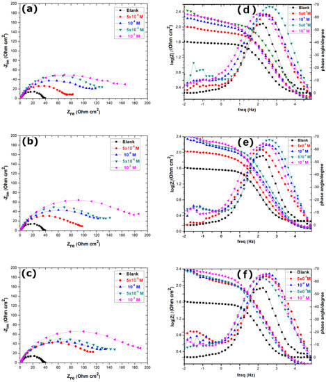 Nyquist (a–c) and Bode (d–f) diagrams of carbon steel in 1.0 mol/L HCl solution in the absence and in the presence of different concentrations of DDA (a,d), PDA (b,e) and MDA (c,f) at 298 K.