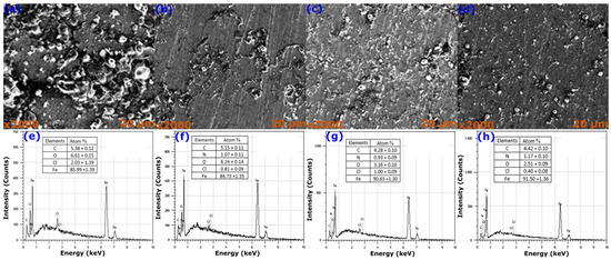 SEM images and EDX data for steel surfaces: (a,e) after immersion in 1.0 mol/L HCl, (b,f) after immersion in 1.0 mol/L HCl + 10−3 mol/L DDA, (c,g) after immersion in 1.0 mol/L HCl + 10−3 mol/L PDA, (d,h) after immersion in 1.0 mol/L HCl + 10−3 mol/L MDA at 298 K.