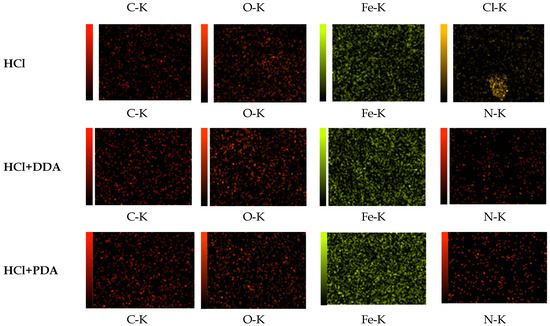 Mapping analysis for carbon steel surfaces after immersion in 1.0 mol/L HCl and in 1.0 mol/L with 10−3 mol/L of inhibitors: DDA, PDA and MDA.