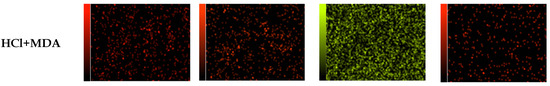 The EDX analysis of blank (Figure 7e) and inhibited solutions (Figure 7f–h) shows high percentages for Cl, O and C elements for the steel exposed to the acid solution without inhibitor, which is in agreement with the literature [42] while the opposite is observed in the presence of the inhibitors. In addition, the spectra indicate the presence of characteristic peaks of nitrogen, as a constituent of the inhibitors on the surface of the steel with no significant decrease in O percentages. This can be a result of the inhibitor molecules adsorbed on the metal surface [58]. The element mapping analysis (Figure 8) also confirms the increase in the percentage of iron and nitrogen in the presence of inhibitors.
