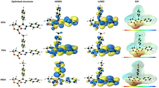 Optimized structures, HOMO and LUMO iso-densities and ESP of inhibitors DDA, PDA and MDA obtained by DFT/B3LYB.