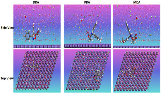 The strength of molecules’ adsorption can also be evaluated energetically by calculating the adsorption energy for each inhibitor-Fe(110) systems. The energetical analysis of optimized adsorption systems for the first adsorption configuration reveals that MDA-Fe(110), PDA-Fe(110), and DDA-Fe(110) adsorption systems have adsorption energies of −2.124, −2.074, and −1.984 eV, respectively. For the first adsorption configuration, MDA-Fe(110), PDA-Fe(110), and DDA-Fe(110) adsorption systems have adsorption energies of −2.897, −1.945, and −2.321 eV, respectively. In both adsorption configurations, the three molecules exhibit a higher negative adsorption energies, indicating their stable and strong adsorption abilities over Fe(110) surface [68,69,70]. Furthermore, the structural difference between investigated molecules seems to influence their interactive force with iron atoms as observed from experimental results. The molecule with methoxy group exhibits the highest magnitude of adsorption energy, followed by methyl-substituted molecule, and parent molecule having the low adsorption energy magnitude. However, this adsorption strength trend seems to be different in the second adsorption configuration. Compounds with electron-donating functional groups such as methoxy are known for their outstanding adsorption and inhibitive properties, which is not surprising in the present study. The unique feature from these simulations is the bond-breaking characteristics of interacting molecules with iron atoms, which could be an additional useful property that increases the corrosion inhibition performance of these compounds.