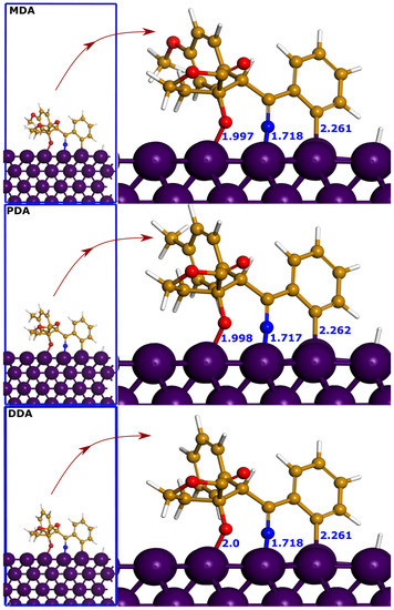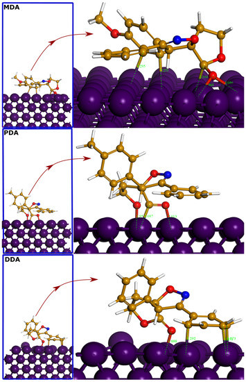 The adsorption is the main mechanism responsible for the effectiveness of organic corrosion inhibitors. To form a protective film on the metal surface, inhibitor molecules interact with metal’s atoms through their active sites. Density functional-based simulations of these interactions can reveal useful insights into the adsorption mechanism and therefore corrosion inhibition performance. To this end, in this section, DFTB simulations were carried out to simulate inhibitor-Fe(110) interactions. In the present work, two initial adsorption orientations were considered for DFTB simulations. Figure 11 and Figure 12 represent the DFTB optimized adsorption geometries of the first and second adsorption configurations of the three compounds on Fe(110) surface. Inspecting results of the optimized adsorption geometries, one can notice that, in the first configuration, the isoxazoline undergoes N–O ring-opening that leads to the formation of bonds between O and N atoms of compounds and Fe atoms. In addition, the non-substituted phenyl bonds with the iron atoms through its carbon atoms. However, no bond-breaking is observed in the second orientation, and molecules tend to bond with the metal atoms with their oxygen and carbon atoms. Looking at bond distances of the first adsorption configuration (Figure 11), it can be observed that the three molecules have nearly the same bond lengths. While the Fe-N and Fe-C bonds have, respectively, lengths of 2.261–1.262 and 1.717–1.718 Å, the Fe-O bond shows a small decrease going from DDA molecule (2 Å) to PDA (1.998 Å) and MDA (1.997 Å). In the second adsorption configuration (Figure 12), it can be noticed that MDA molecule forms several bonds with iron atoms through its carbon and oxygen atoms. The same can be said for the PDA and DDA molecules, which also show high affinity to bind with iron atoms. In the three optimized geometries of the second adsorption configuration, the bond distance for Fe-O is between 2.05 and 1.88 Å while that of Fe-C is ranging from 2.09 and 2.29 Å. The nature of these formed bonds can be discussed in terms of the sum of covalent radii of the interacting atoms. The sum of the covalent radii value for Fe-C (rC + rFe), Fe-N (rN + rFe) and Fe-O (rO + rFe) are reported to be 2.08, 2.03 and 1.98 Å, respectively [66]. By comparison with bond distances, it can be concluded that all bond distances are within the sum of covalent radii of interacting atoms. It highlights that formed bonds are mostly covalent in nature. The 2-isoxazoline ring system is known for the low thermochemical stability of its N-O bond, which makes it very reactive especially when interacting with reactive chemical species [67]. This can be very beneficial when interacting with iron atoms, favoring the formation of strong covalent bonds and therefore strengthening the molecule’s adsorption. It should also be noted that inhibitor molecules demonstrated high coordination ability with iron atoms in different orientations.