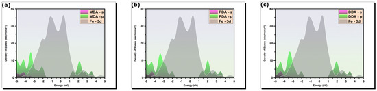 The geometrical analysis of the optimized adsorption geometries revealed that investigated compounds can form covalent bonds with iron atoms. However, more assessment is needed to clarify the characteristics of the formed bonds and nature of charge distribution between molecules and Fe atoms. For this purpose, the projected density-of-states plots were extracted from optimized isolated molecules, adsorbed far from the iron surface, and from the optimized adsorption systems of both configurations, to compare the changes in the chemical states before and after the adsorption of molecules. Figure 13 represents the PDOSs of isolated molecules while Figure 14 represent the PDOS of molecules after the adsorption on the iron surface. From Figure 13a–c, one can notice that PDOSs show well-defined chemical states with intense peaks within the energy range of iron 3d orbital electronic states. By inspecting the PDOSs plots for the adsorbed systems in Figure 14, it can be observed that the intensity of peaks decreases, and they exhibit broadening induced by interactions between molecules’ atoms and iron atoms. These remarks indicate that inhibitor molecules participate in strong interactions with iron atoms through charge transfer that is validated by the strong hybridization of p-states of the inhibitor molecules as evident in the PDOS plots [23,24]. This strengthens and confirms the conclusions made from the adsorption geometry systems of adsorbed molecules.