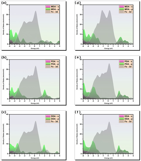 Projected density of states of adsorbed inhibitor molecules MDA, DDA and PDA on Fe(110) surface; (a–c) first adsorption orientation, and (d–f) second adsorption orientation.