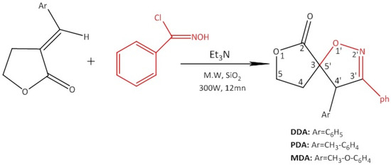 - Youssefi, Y.; Ou-ani, O.; Oucheikh, L. Synthesis of New Heterocycles with a Spiran Junction (Spiro 2-Isoxazoline-γ-Lactone) Using the Microwave Oven Technique in a Dry Environment (SiO2). Org. Chem. Ind. J. 2021, 15, 32. [Google Scholar]